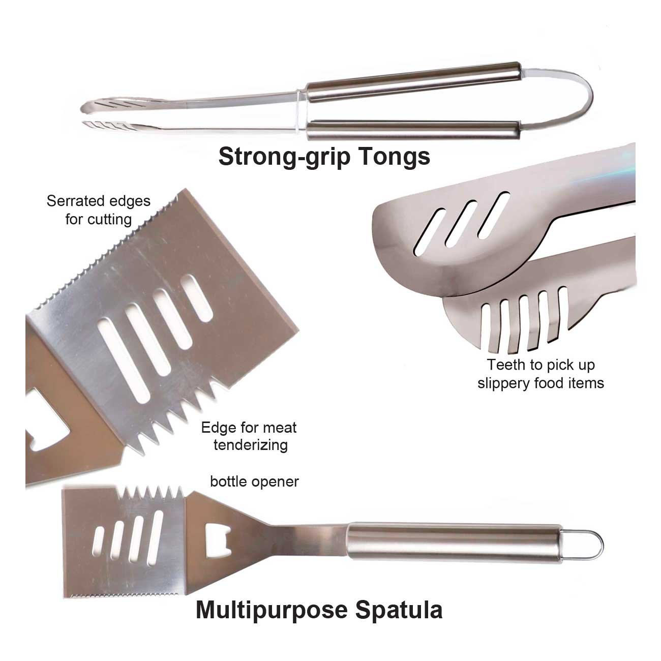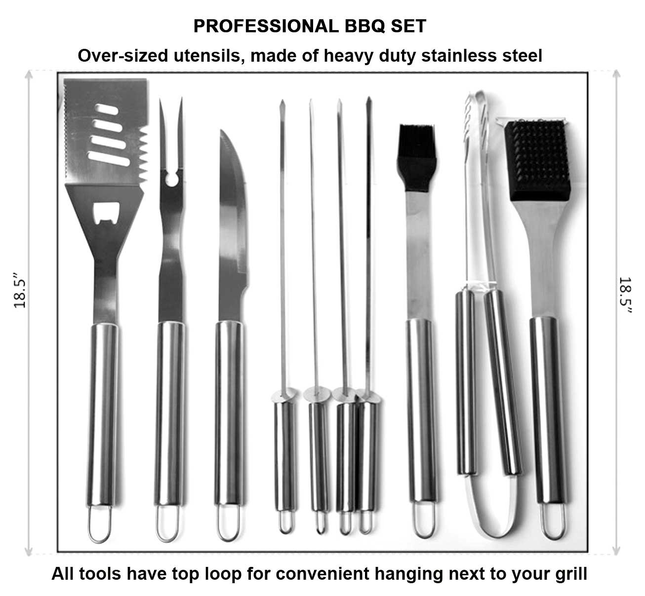 Utensils are made of restaurant quality heavy duty stainless steel and are dishwasher-safe. They will never rust or crack serving you in preparing amazing barbeque for the years to come. Make them remember your BBQ using the 10-piece utensil set, including: