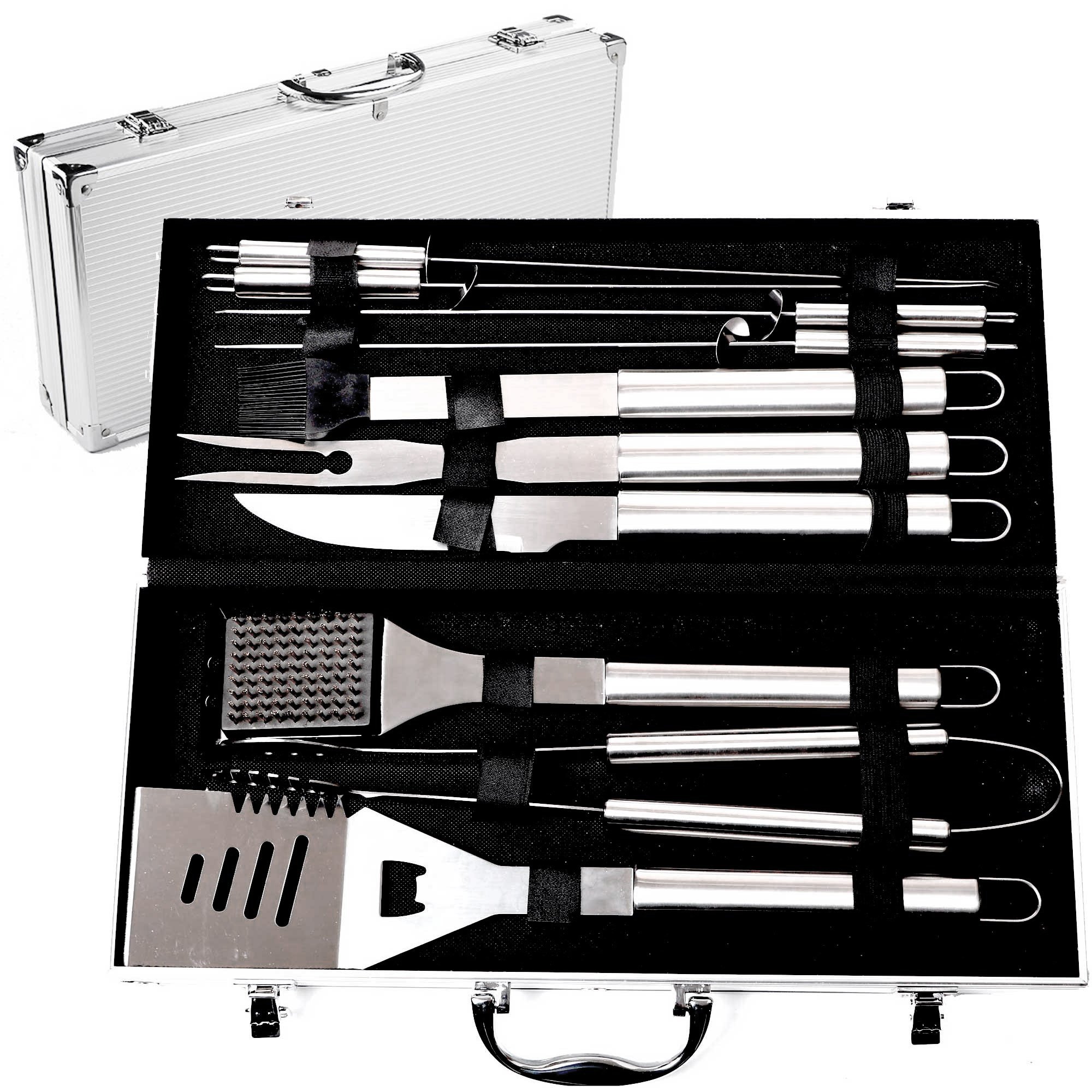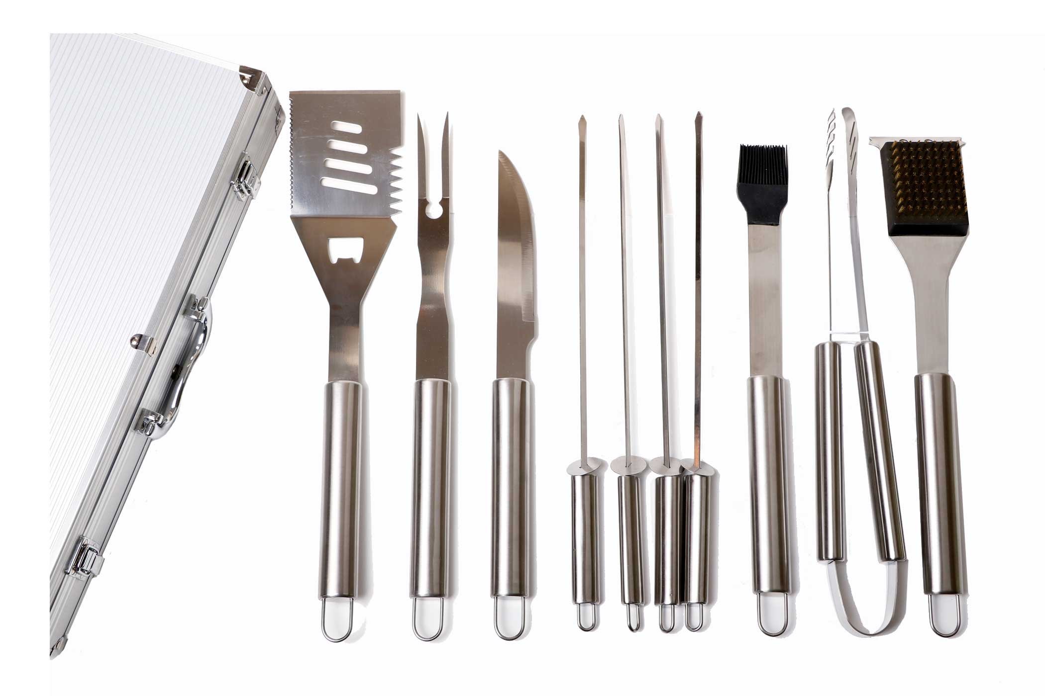 • SLEEK ALUMINUM CASE MAKES IT EASY TO CARRY – This grilling tool set comes in an impressive strong aluminum case with dual latches for secure storage. Stay assured your bbq tools and accessories will stay like new for years to come. Carry this aluminum case and arrive at the cookout, picnic or tailgate party looking like a pro