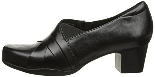 Details: Project your seasonal staple with the ravishing Rosalyn Adele pump. Leather upper with elegant pleating details. Easy slip-on with goring for a comfortable fit. Soft synthetic lining. Cushioned Ortholite footbed provides optimal comfort. Clarks plus technology. Durable rubber outsole.
