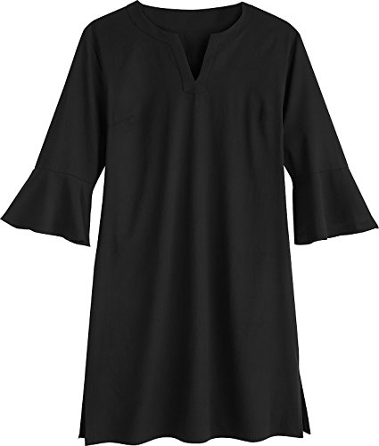 - FEATURES: Notch neckline and 3/4 length sleeve with flounce detail; Tunic length dress: 36 1/2 inch body length (size Medium); Machine wash, tumble dry; Imported