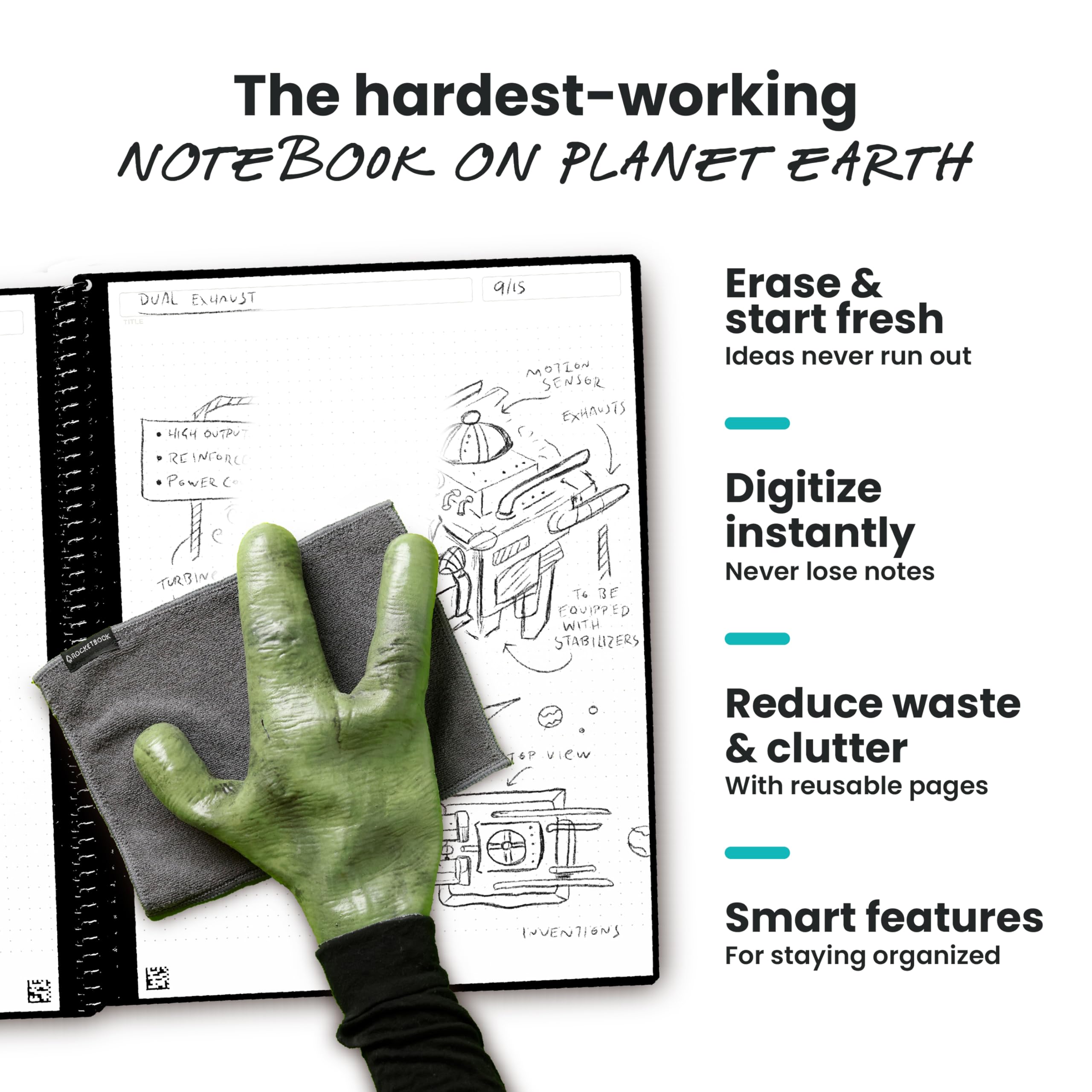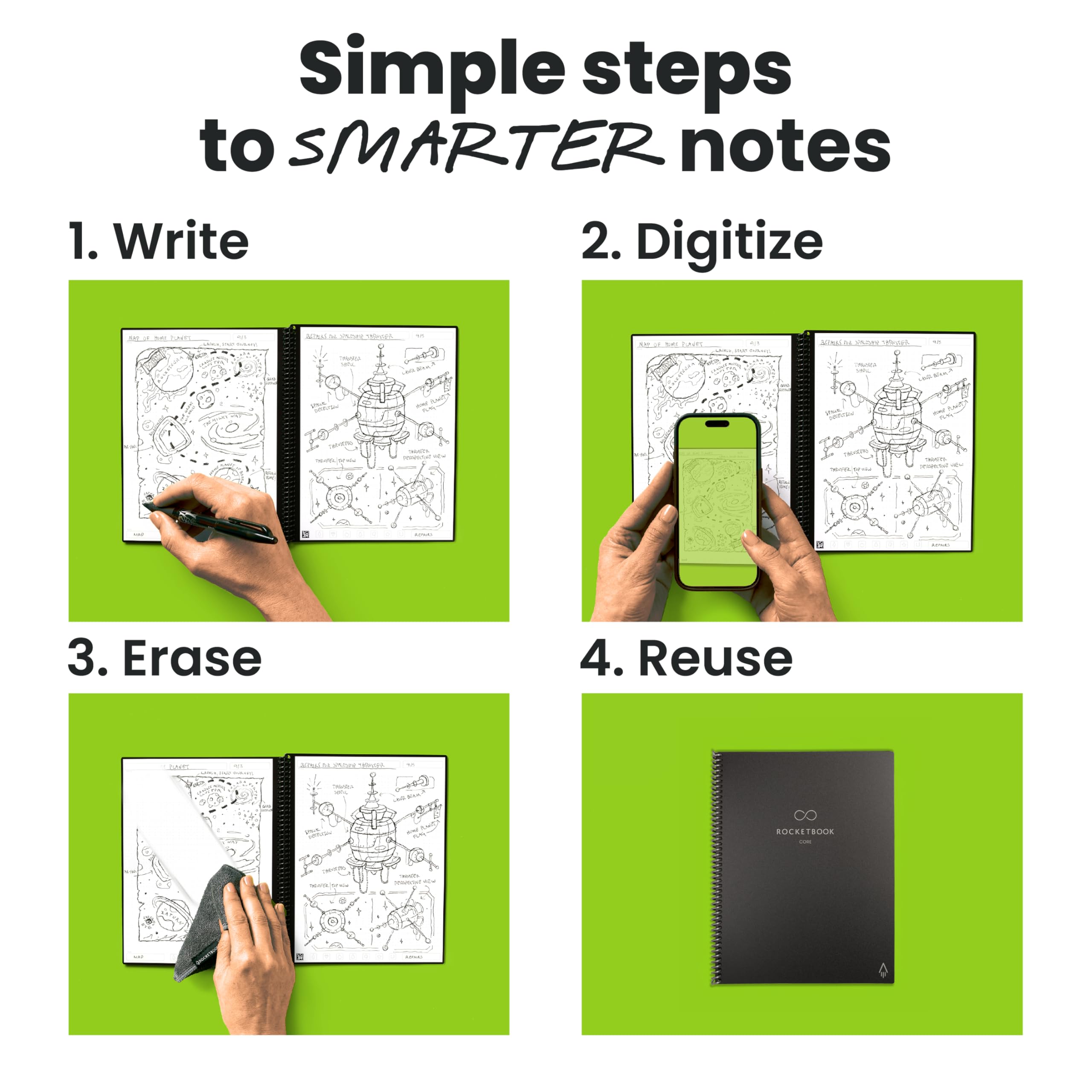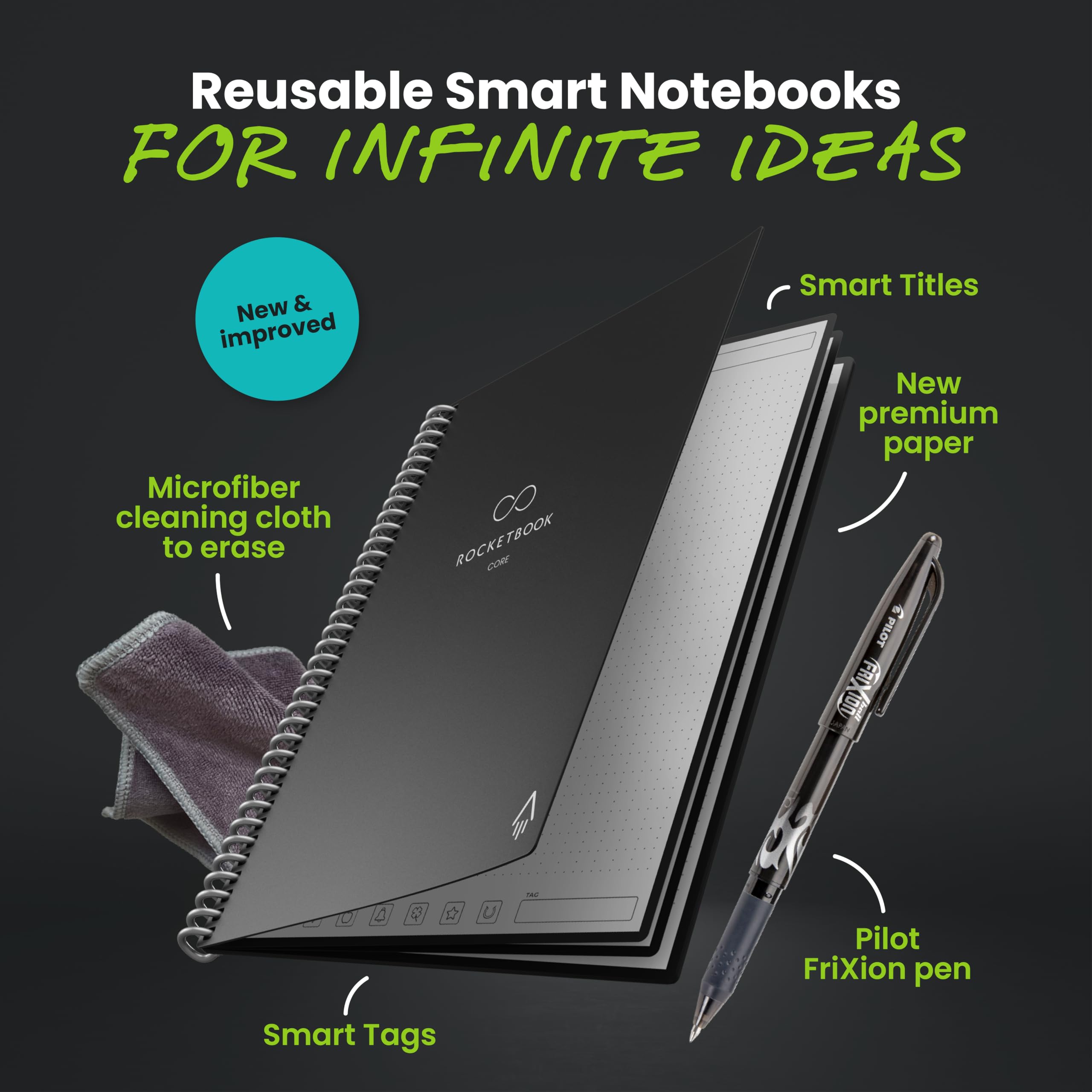 • New and Improved Core: Features premium reusable paper, with improved pen to paper feel, spiral binding and sleekly re-designed, scratch-resistant cover. Grid layout pages now include Smart Titles and Smart Tags to name and organize files efficiently.Create, Digitize, Erase, Re-Create: Capture ideas with the included Pilot Frixion Pen, digitize effortlessly using the Rocketbook app, store in your preferred cloud service. When done, simply wipe the pages clean with a damp cloth and start fresh.