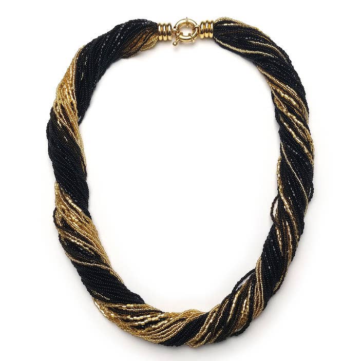 Twist multi-strand Murano glass beaded jewelry. Collection includes necklace, clasp bracelet, and pushback button earrings. Handcrafted by master artisans in Venice, Italy.