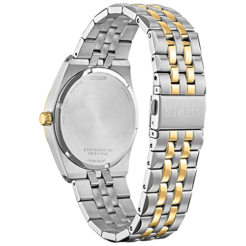 A classic timepiece is always in style in the Corso men’s watch from Citizen. Featuring a two-tone gold and silver-tone stainless steel bracelet and case with a 3-hand white dial and date indicator, luminous hands and gold-tone markers, this elegant timepiece also features a fold-over clasp closure with hidden push buttons and is water resistant to 100 meters. If you’re looking for a dress watch to add classic style to your wardrobe, look no further – the Corso is the perfect choice. It also uses Citizen’s Eco-Drive technology, so it is sustainably powered by any light and will never need a battery. Caliber number E111.